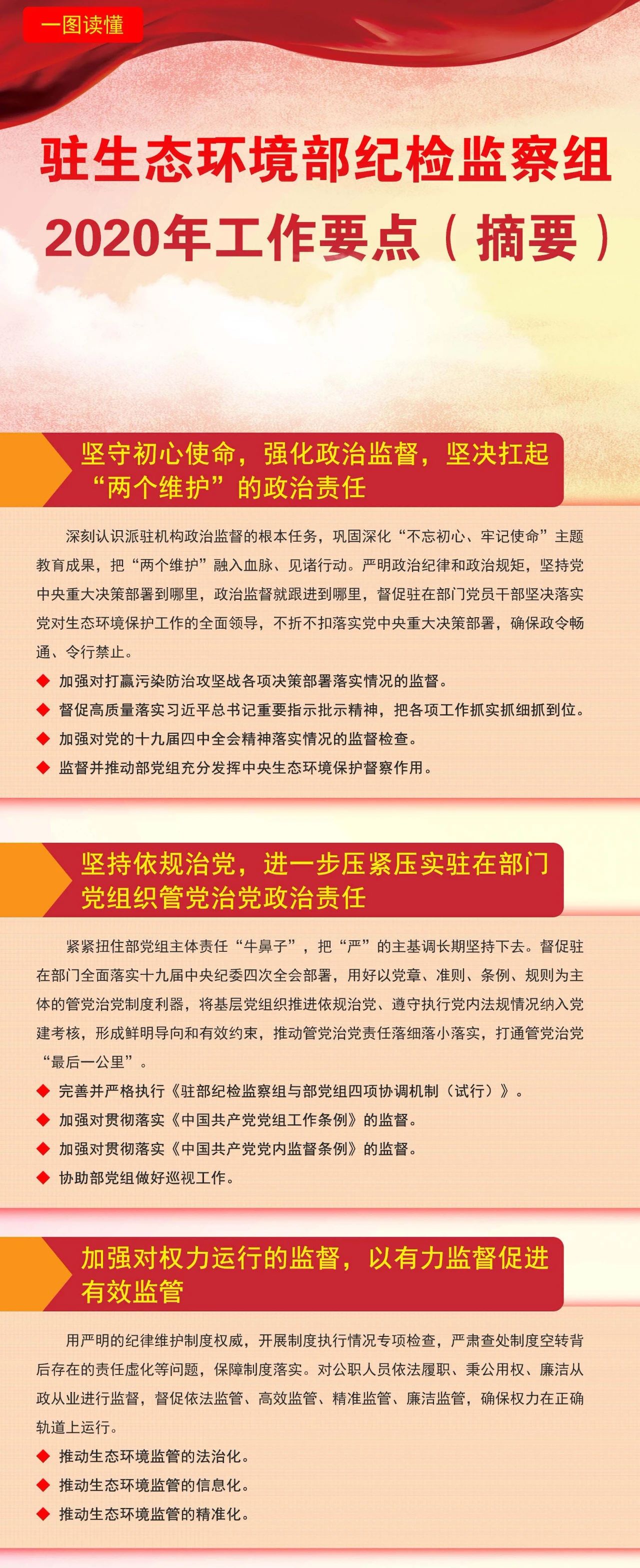 中央紀(jì)委國(guó)家監(jiān)委駐生態(tài)環(huán)境部紀(jì)檢監(jiān)察組(以下簡(jiǎn)稱駐部紀(jì)檢監(jiān)察組)要以習(xí)近平新時(shí)代中國(guó)特色社會(huì)主義思想為指導(dǎo),深入貫徹黨的十九大和十九屆二中、三中、四中全會(huì)精神,認(rèn)真落實(shí)十九屆中央紀(jì)委四次全會(huì)部署和深化派駐機(jī)構(gòu)改革要求,增強(qiáng)“四個(gè)意識(shí)”、堅(jiān)定“四個(gè)自信”、做到“兩個(gè)維護(hù)”,堅(jiān)守政治監(jiān)督職責(zé),堅(jiān)持穩(wěn)中求進(jìn)工作總基調(diào),強(qiáng)化對(duì)權(quán)力運(yùn)行的制約和監(jiān)督,一體推進(jìn)不敢腐、不能腐、不想腐,推動(dòng)駐在部門全面從嚴(yán)治黨向縱深發(fā)展,在堅(jiān)持和完善中國(guó)特色社會(huì)主義制度、推進(jìn)生態(tài)環(huán)境治理體系和治理能力現(xiàn)代化中充分發(fā)揮監(jiān)督保障執(zhí)行、促進(jìn)完善發(fā)展作用,為決勝全面建成小康社會(huì)、打贏污染防治攻堅(jiān)戰(zhàn)提供堅(jiān)強(qiáng)保障。