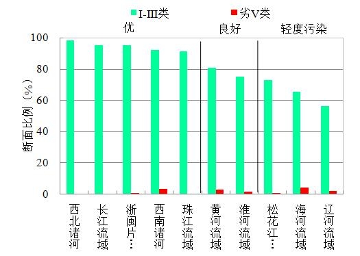 1-4月,長(zhǎng)江、黃河、珠江、松花江、淮河、海河、遼河等七大流域及西北諸河、西南諸河和浙閩片河流Ⅰ-Ⅲ類水質(zhì)斷面比例為84.5%,同比上升7.2個(gè)百分點(diǎn);劣Ⅴ類為1.2%,同比下降4.9個(gè)百分點(diǎn)。主要污染指標(biāo)為化學(xué)需氧量、高錳酸鹽指數(shù)和氨氮。其中,西北諸河、長(zhǎng)江流域、浙閩片河流、西南諸河和珠江流域水質(zhì)為優(yōu),黃河和淮河流域水質(zhì)良好,松花江、海河和遼河流域?yàn)檩p度污染。